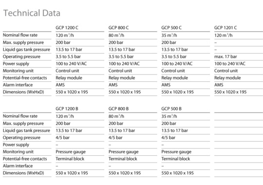 The Gas Control Panel platform concept enables adaptation to the respective gas supply requirements in any type. In addition to the three different flow performance levels with 35, 80 or 120 m³/h, the control unit and the alarm system may be customized in different variations. Upgrading from the performance level 80 to 120 m³/h or from Version GCP Basic to GCP control remains possible later on, even during active operation. All components under the removable housing are easily accessible and designed so that all necessary service activities may be performed without interrupting the gas supply.